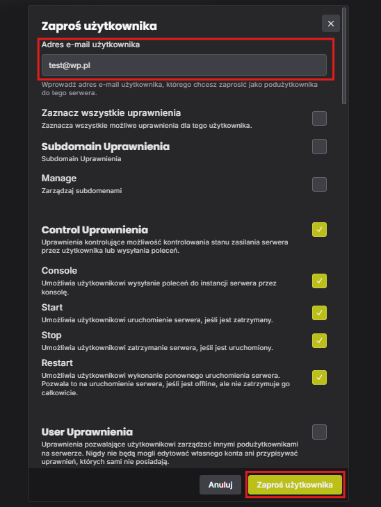 Zaznacz permisje, które chcesz nadać drugiej osobie, a następnie kliknij „Zaproś użytkownika”.